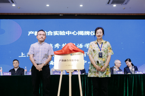 开幕式的最后环节为“产教融合实验中心共建揭牌仪式”。我校常务副校长魏小琳教授与上海文策翻译有限公司华东区总监旷浩敏先生、我校副校长陈文涛教授与上海一者信息科技有限公司大区总监张瑞女士,一起为中心揭牌并合影留念。