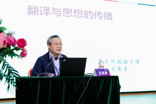 北京外国语大学王克非教授围绕“翻译与思想的传播”这一主题,强调翻译不仅是语言文字的转换,更是思想文化的沟通。他认为,译介作为语际传播的一种形式,是一种跨语言、跨文化、跨理念、跨地域、跨年代(时空)的复杂传播过程,思想文化的译介是在不同社会关系中进行的,是这些社会关系的综合体现。通过翻译史实,他分析了思想翻译传播中的多个要素,包括思想要素、时空要素、接受环境要素、接受者/译者要素以及解读要素等。
