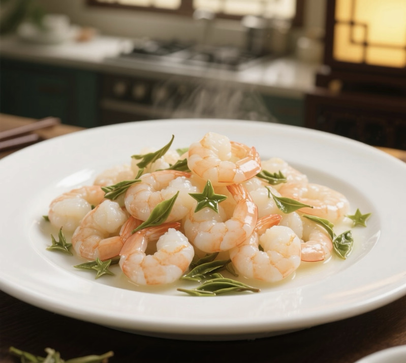 Shelled shrimps cooked in Longjing tea - as the Longjing tea is taken as the best tea in Hangzhou, which is reputed for greenness, fragrance, pure taste, and elegant looks, when the living shrimps are stir-fried in the Longjing, the dish sends a refreshing aroma and is quite delicious.