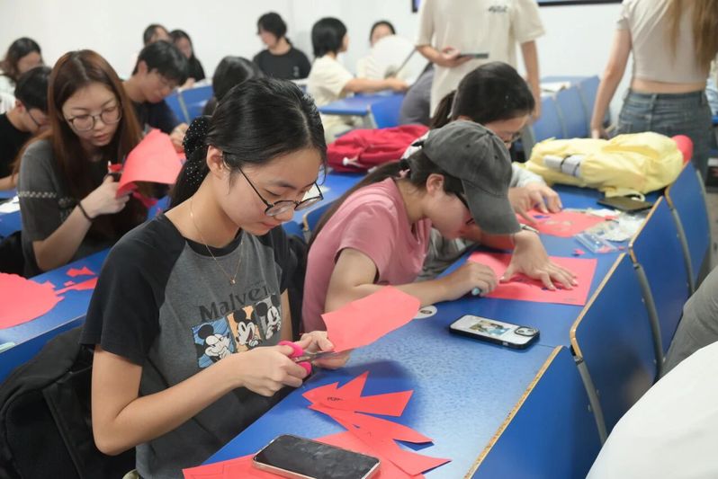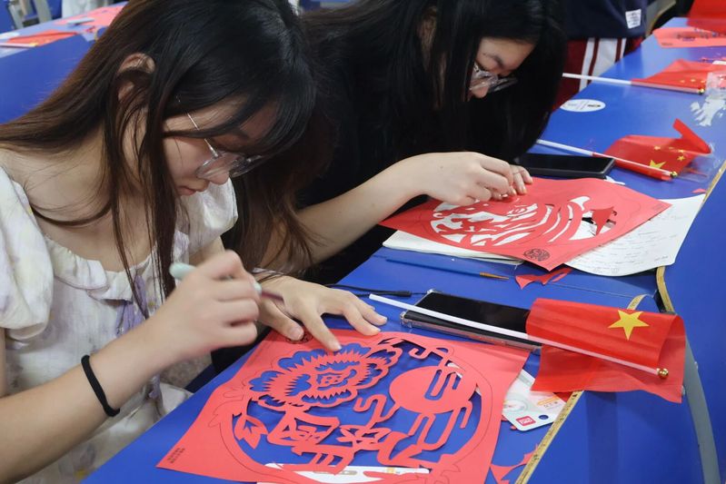 活动以中华传统剪纸艺术为依托,同学们巧思迸发,将国旗、灯笼、玉兔等意象落于纸上——这些图案既是祖国繁荣的缩影,亦是家国情怀与中秋团圆的象征。指尖剪刀流转间,对祖国昌盛的祈愿化为细密纹理,纸张在光影中舒展,每一道纹路都映照着对伟大祖国的赤诚深情。