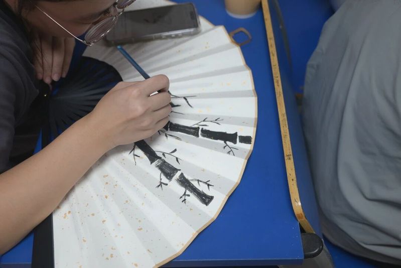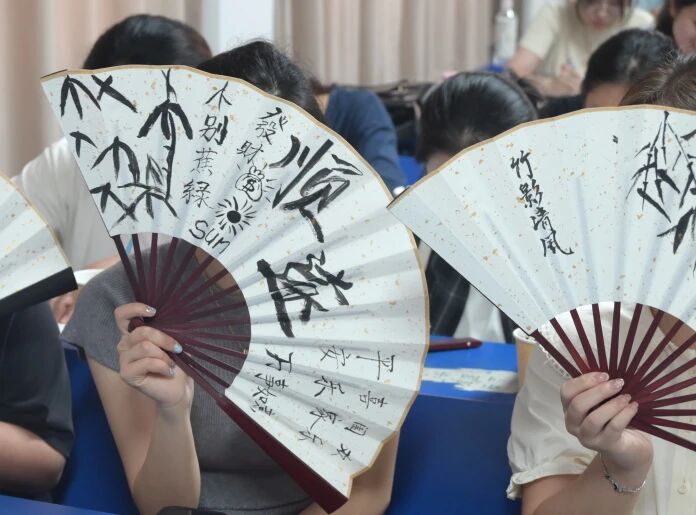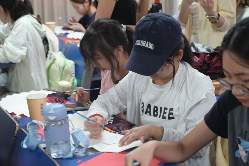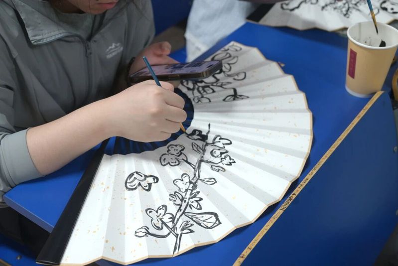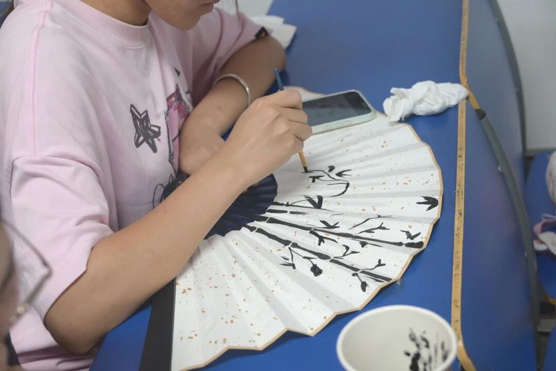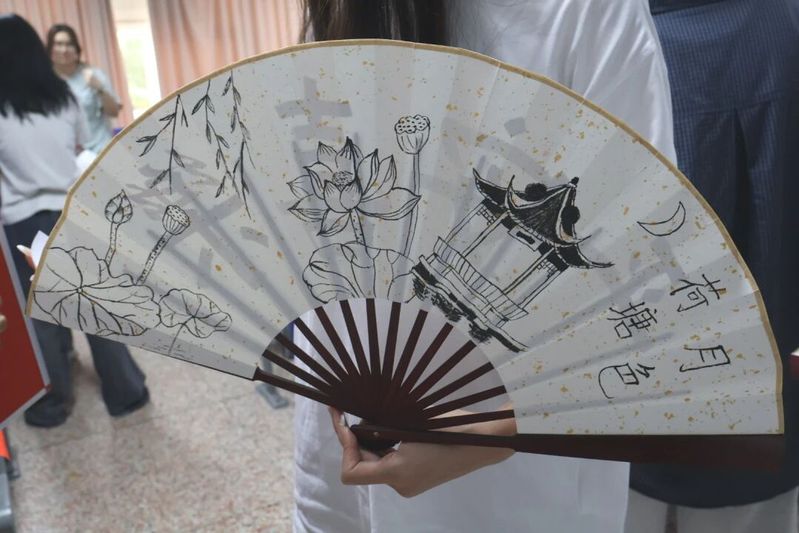 同学们以折扇为画布,左手轻扶扇面、右手执笔落墨,将中秋意蕴与美好期许细细勾勒:笔下既有荷花、竹影等清雅景致,也有“顺遂”等祈愿字样,字里行间满是对佳节的热忱。原本朴素的折扇,在创作中被赋予了中秋独有的温度,既承载着传统书画的雅致韵味,更让蒲公“英”的个人心愿与家国情怀相融——扇面流转的不仅是清风,更有对阖家团圆的期盼、对祖国昌盛的祝福,让青春理想与中秋月色、时代脉搏同频共振。