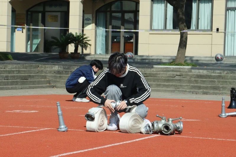 赛场之上,紧张有序的氛围中,英语学院参赛学子身姿矫健、利落果敢。甩带对接疾如闪电,负重奔袭步稳劲足,灭火器折返瞄准喷射一气呵成,每一个动作规范标准、每一次反应迅捷灵敏,充分展现了英语学院学子严谨的专业素养与昂扬向上的精神风貌。每一套流畅动作都透着扎实积累,每一秒的全力冲刺都彰显着青春的蓬勃锐气。场边观赛的英语学院师生掌声不断,在沉浸式互动体验中进一步加深了对消防安全知识的理解,切实实现了“以赛促学、以赛促练”的教育目标。