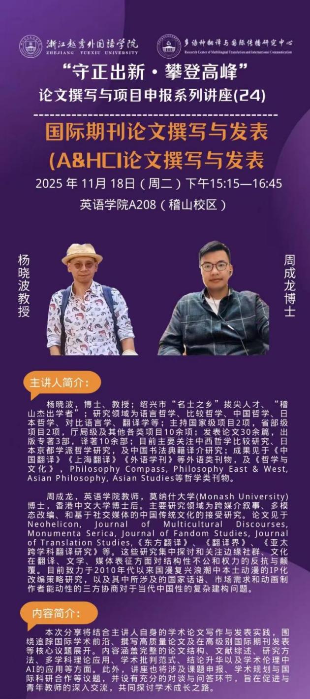 2025年11月18日,浙江越秀外国语学院英语学院联合多语种翻译与国际传播研究中心,举办了一场以“国际期刊论文撰写与发表(A&HCI论文撰写与发表)”为主题的学术讲座。本次活动邀请我院杨晓波教授与周成龙博士联袂主讲,由曹环副教授主持。讲座吸引了校内多个学院教师参与,交流氛围热烈。