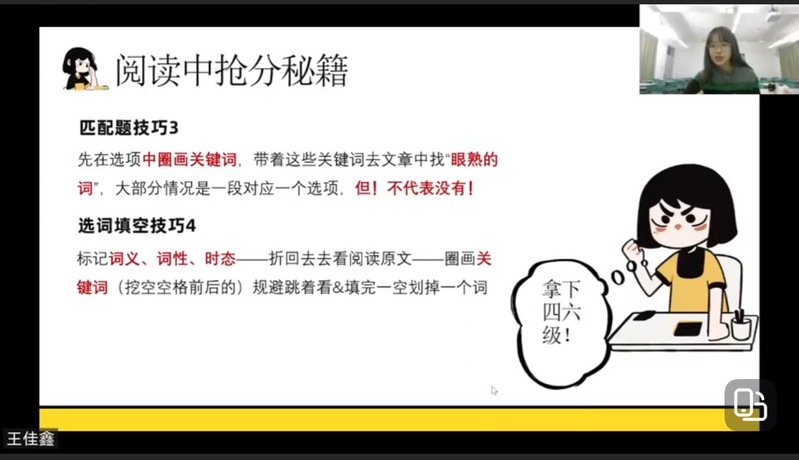 在本次四六级备考高分攻略线上分享会中,王佳鑫同学从自身学习经验出发,对备考的多个关键方面进行了深入分析与详细指导。她指出,在听力部分,要善于从“变”中寻“不变”,掌握技巧是取得高分的关键;在阅读部分,需把握答题节奏,精准定位信息;在写作与翻译部分,应灵活运用模板,避免出现“中式英语”;在备考时间与心态方面,更要注重细节,因为细节往往决定成败。最后,王佳鑫同学建议同学们在考试过程中保持平常心,做到“不纠结于未听清的词句,不轻易修改答案”,合理分配时间,以从容应对考试。