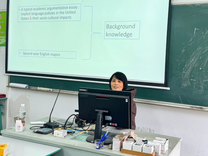 冯秋琴老师则从学情分析入手,针对大二学生政治与文化背景知识不足的特点,系统分享了如何通过任务设计分解教学难点。她设计了阶梯式任务链:Step1 以“用一两个词描述语言”实现全员参与,并通过“推测美国无官方语言原因”激活学生已有知识;Step2 通过词汇匹配、议论文框架搭建等环节,训练学生泛读与信息整合能力;Step3 聚焦文本难点段落,引导学生关注案例与观点的逻辑关系;Step4 引导学生挖掘作者隐含立场,理解“文化同化”背后的意识形态;Step5布置作业以实现从输入到输出的能力跃升。
