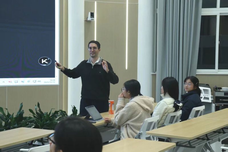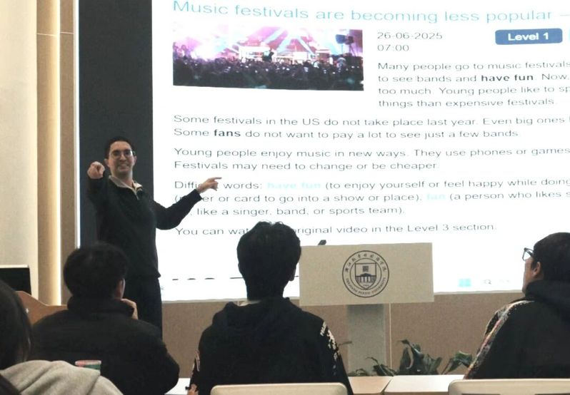 实战演练环节精彩纷呈。外教以多个趣味场景为依托,组织角色扮演实践,鼓励同学们摆脱生硬表达、融入情感演绎,助力突破表达拘谨;商务英语研读板块聚焦AI机器人、屏幕使用、音乐节等热门主题,通过讲解文章生词难点、引导分享见解,围绕技术影响、健康习惯等话题展开深度交流,在思维碰撞中强化语言逻辑与应用能力。活动中,外教反复强调口语表达的重要性,不断鼓励大家摒弃胆怯、主动开口,同学们也从起初的羞涩犹豫,逐渐转变为大胆分享,全程展现出浓厚的学习热情。