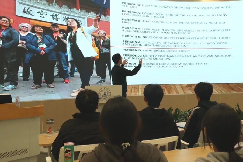 活动伊始,外教明确了涵盖趣味热身游戏、影视听力训练、商务英语研读、角色扮演实战的四大核心模块,清晰勾勒出语言提升路径。热身环节,英文单词接龙游戏迅速点燃现场氛围,同学们遵循“单词不重复、难度不降低”的规则积极参与,在抢答互动中激活词汇储备;影视学习板块,通过播放《回到未来》《夏日友晴天》等经典片段,引导大家聆听分析、分享感悟,在光影世界中感受语言魅力与文化内涵,同步锤炼听力理解能力。