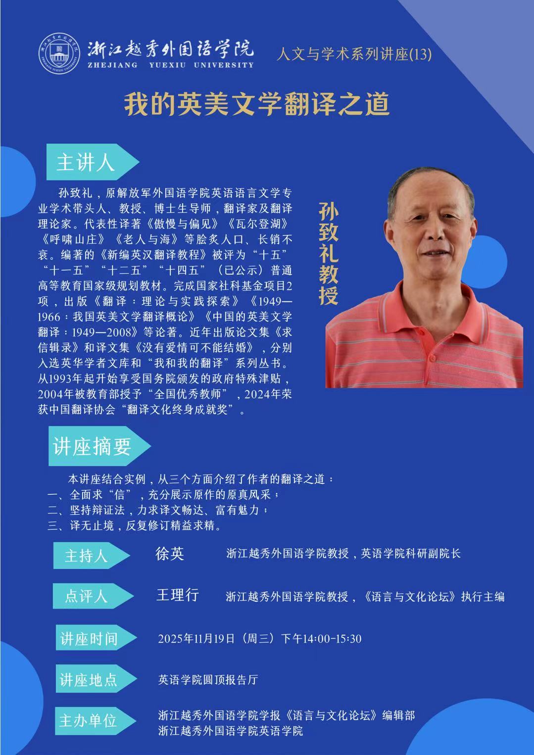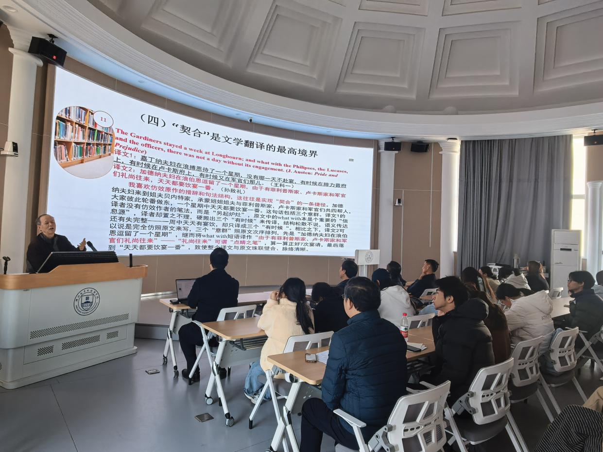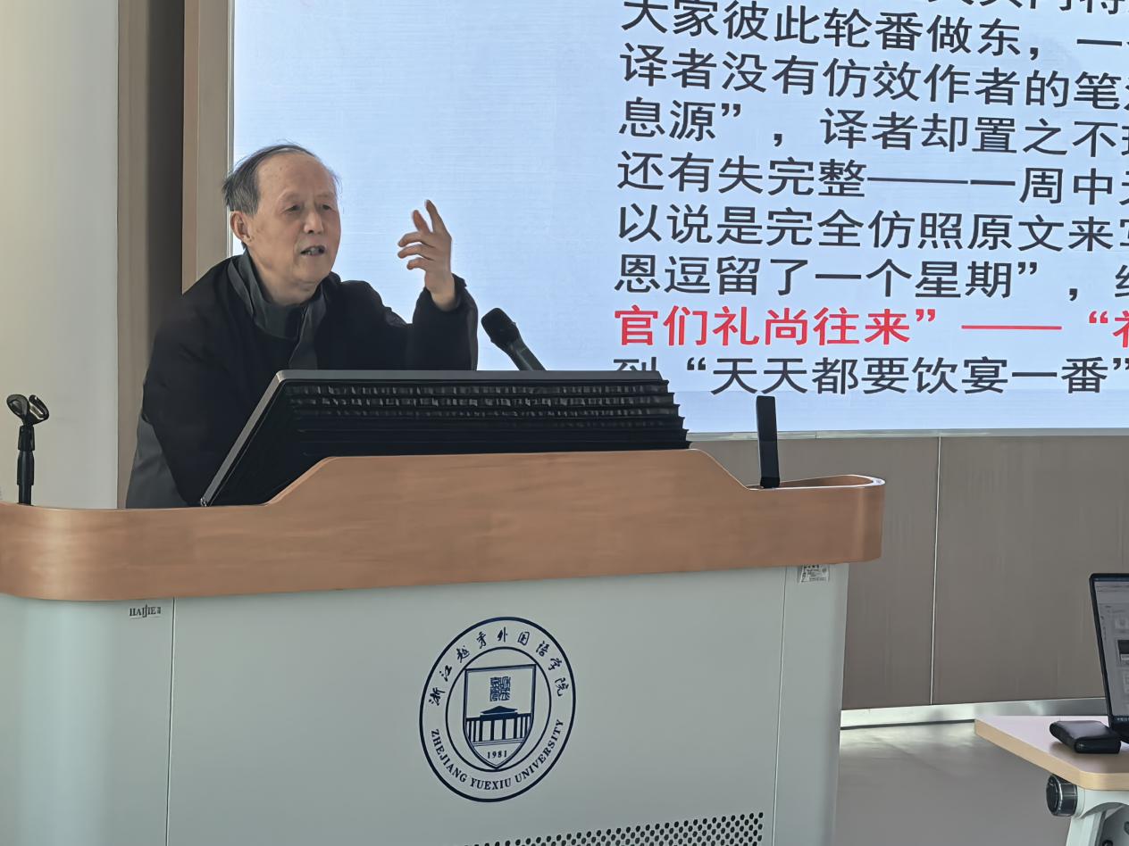 2025年11月19日,浙江越秀外国语学院学报《语言与文化论坛》编辑部联合英语学院,邀请我国著名翻译家及翻译理论家孙致礼教授来我校讲学,他以“我的英美文学翻译之道”为题,为师生讲授文学翻译之道。本次活动由英语学院科研副院长徐英教授主持,共吸引多个学院共60余名师生到场学习,现场学术氛围浓厚。