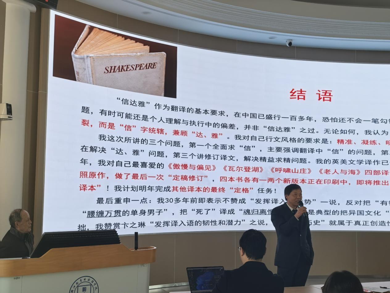 深耕译界数十载,孙教授凭借《傲慢与偏见》《老人与海》《瓦尔登湖》等经典译著,成为连接中西方文学的重要纽带。此次分享中,他以“理念演变”“辩证实践”“精益求精”为脉络,系统梳理自身翻译生涯的思考与感悟,为文学翻译从业者与高校师生揭开了英美文学经典“落地”中文世界的神秘面纱,展现了一位翻译家对“信达雅”的当代诠释与坚守。