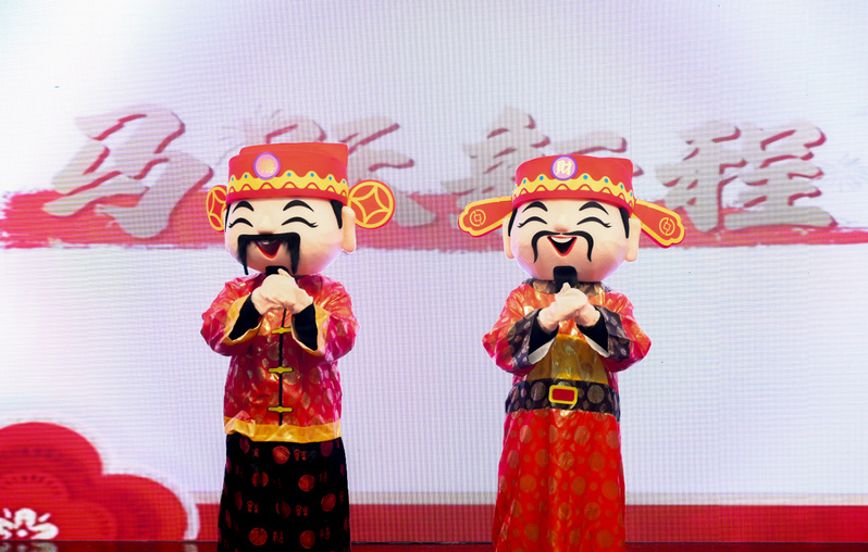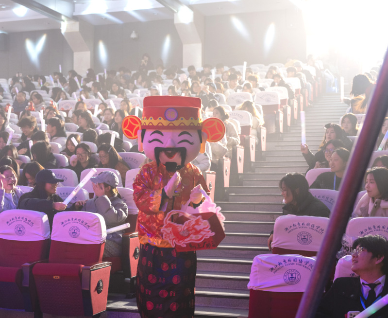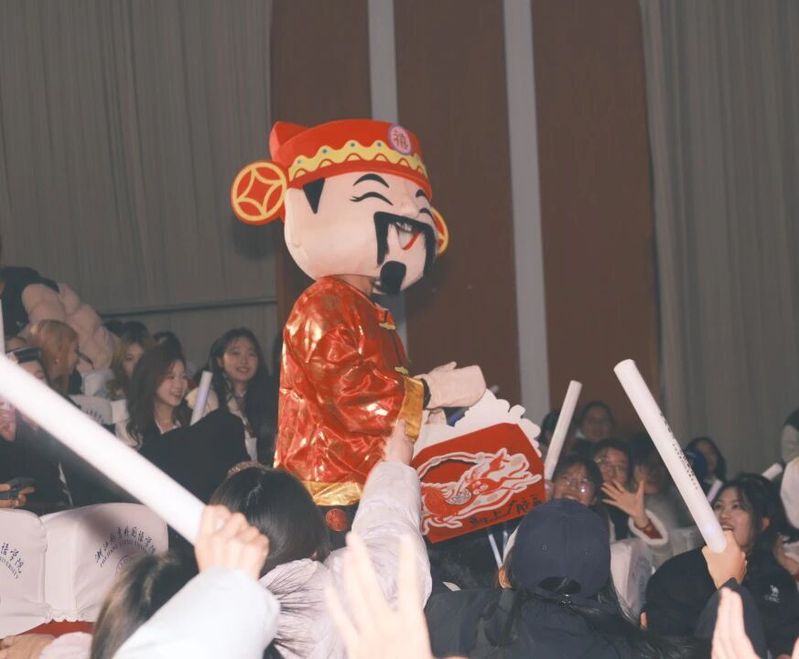 晚会更藏暖心惊喜:生日祝福视频温情播放,喜庆装扮的“财神爷”为当天生日的英语2505班蔡美龄、商务英语2501班桂紫茹两位同学送上蛋糕与礼物,全场瞬间沸腾,温情与热烈交织成晚会高光时刻,现场满溢着家一般的温情。
