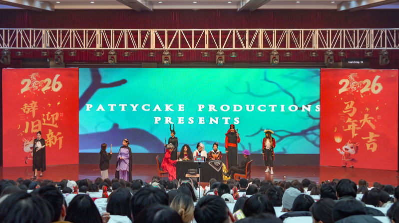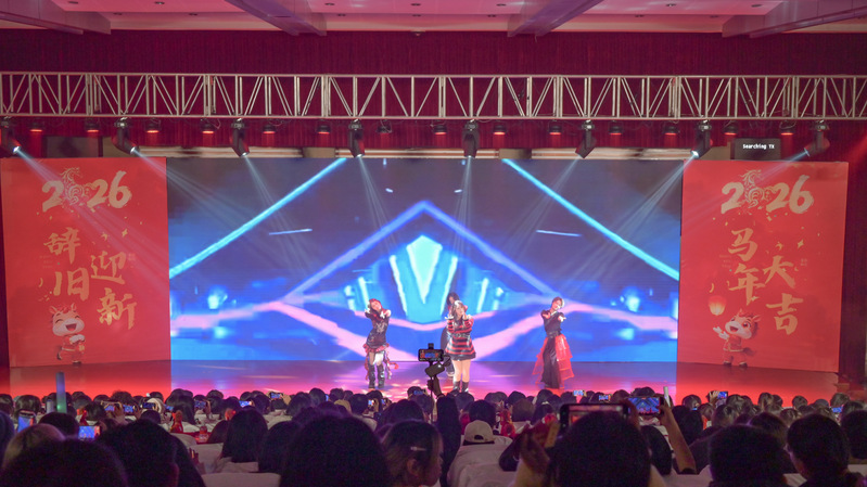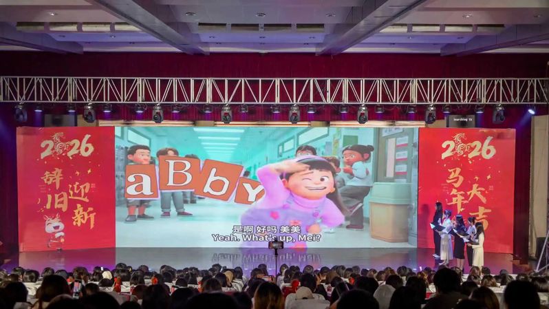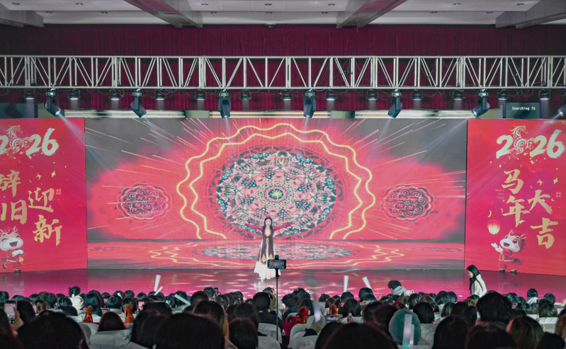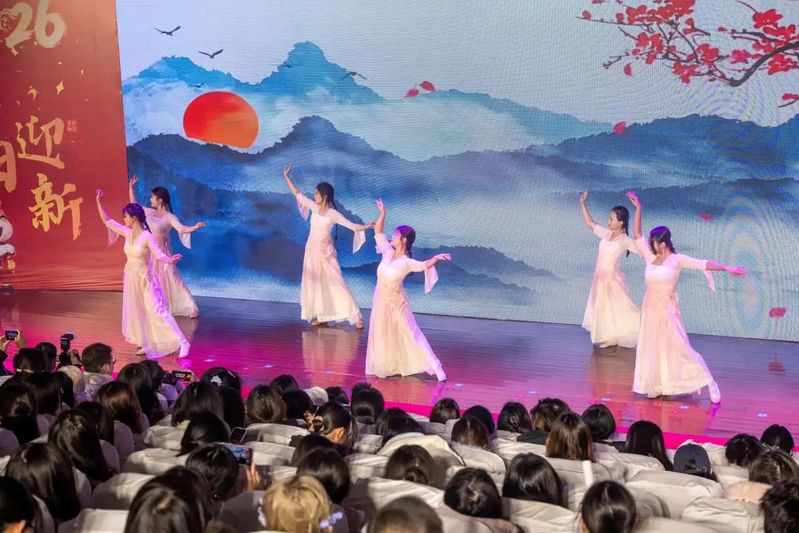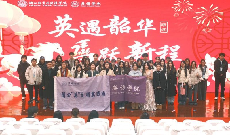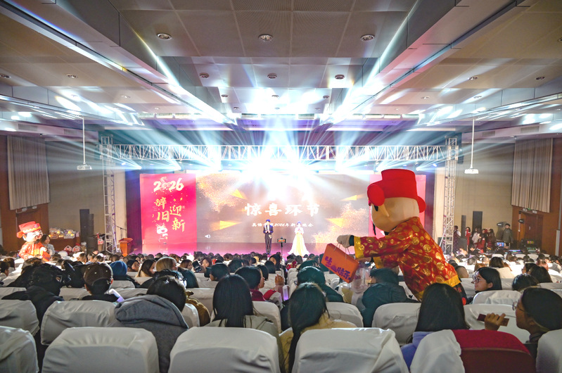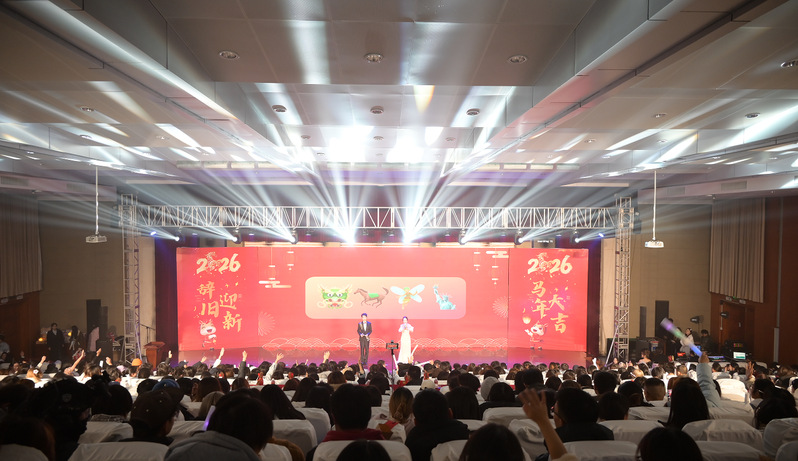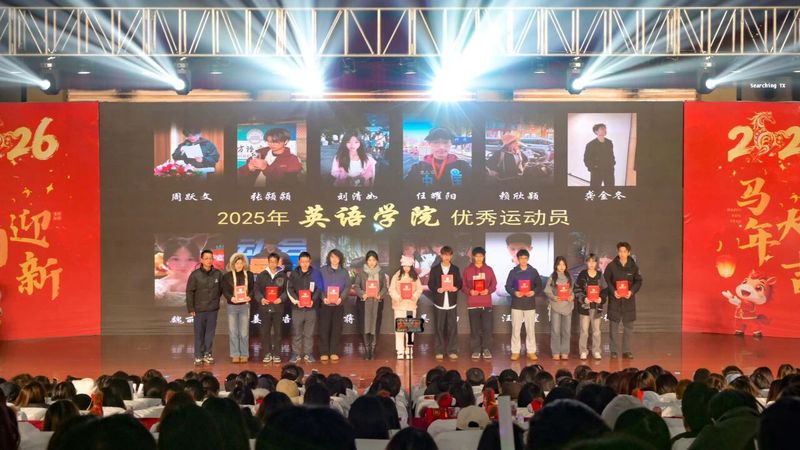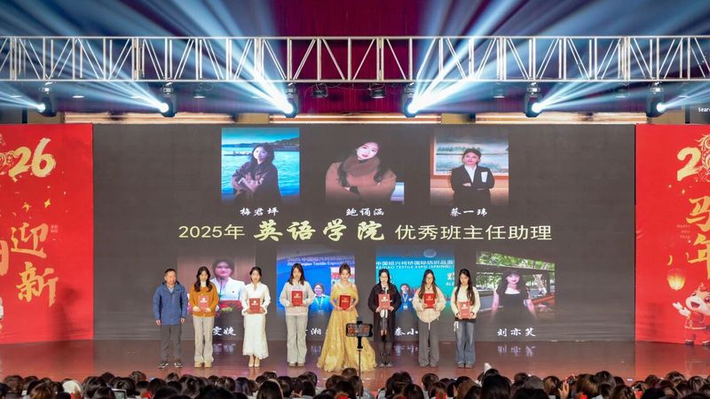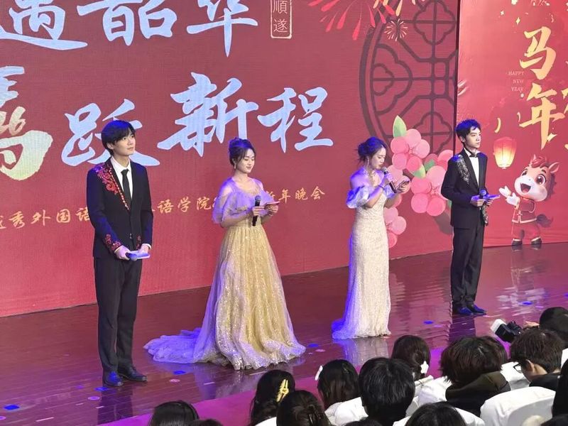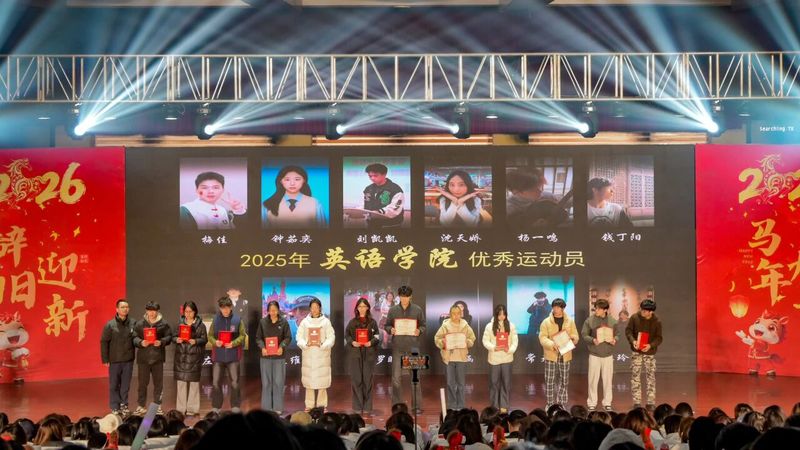 岁聿其莫,新元肇启。当冬日的暖阳渐敛余温,青春的旋律在校园回荡。12月14日晚,综合楼报告厅灯火璀璨、暖意融融,“英遇韶华,马跃新程——英语学院2026新年晚会”顺利举行。英语学院党委书记李敏、英语学院副院长徐英、英语学院党委副书记俞科安,及师生代表齐聚一堂,共赴这场辞旧迎新的青春之约,共绘学院发展的崭新蓝图。