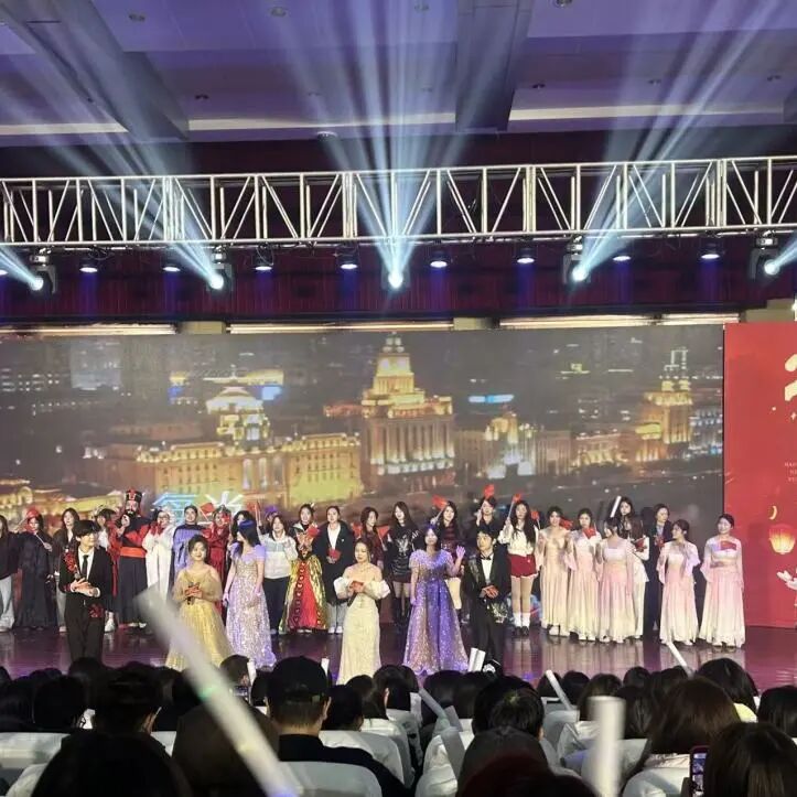 本次晚会由商务英语2205班蹇蕊、翻译2302班徐雯婕、英语2302班汤晨、英语2504班顾洲荣联袂主持,他们在全场热切的期待中宣布晚会正式开始。舞台灯光流转间,一场融合语言魅力与青春活力的视听盛宴就此展开。