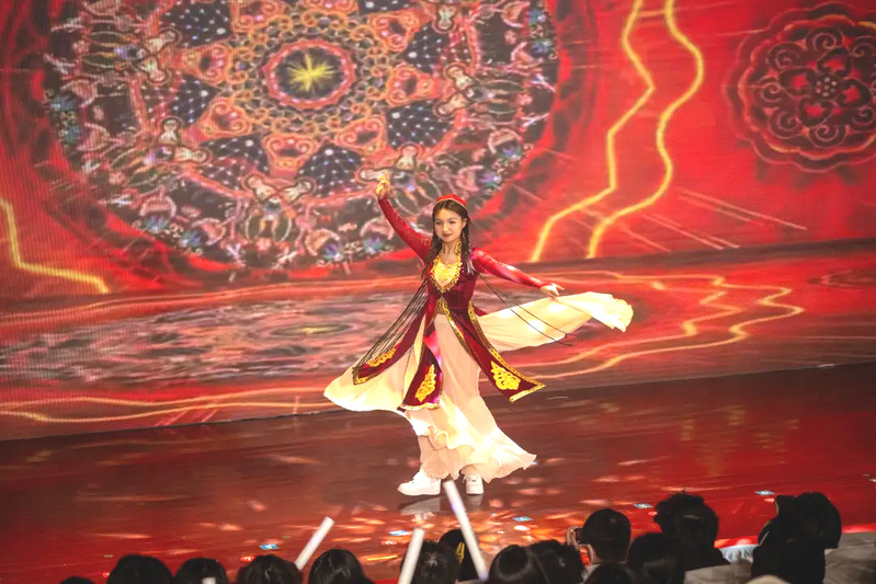 民族风情亦添雅韵,最具特色的新疆舞《altun tataymu》紧随其后,迪菲尔·吐鲁洪同学身着特色服饰登台,舞姿灵动如蝶、风情浓郁醇厚,每一个旋转与跳跃都盛满对生活的热爱,更生动诠释出“民族一家亲”的深厚情谊,让多元文化的魅力在舞台上尽情绽放,打动了在场每一位观众。