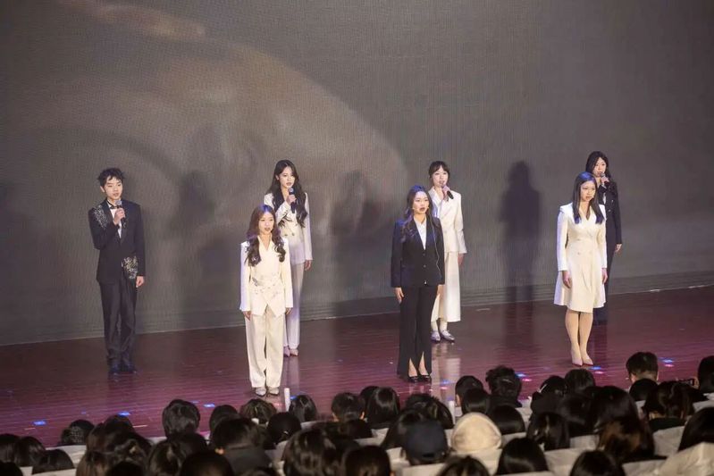 作为压轴节目,徐诺和吕得恩携手登台,深情演绎《我爱你中国》,旋律流转间,全体演职人员纷纷加入,与现场观众一同唱响这曲经典赞歌,激昂赤诚的歌声响彻整个报告厅,每一句都饱含着对祖国的深切热爱与对学院的深厚情谊。