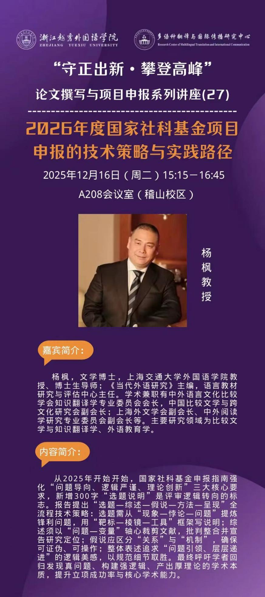 2025年12月16日下午,应英语学院及多语种翻译与国际传播研究中心邀请,上海交通大学外国语学院教授、博士生导师、《当代外语研究》主编杨枫教授,为我校教师作了题为“2026年度国家社科基金项目申报的技术策略与实践路径”的专题学术讲座。讲座由英语学院院长王建香教授主持,教师踊跃参与。