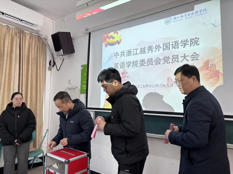 2025年12月29日中午,中共浙江越秀外国语学院英语学院委员会党员大会于A114教室举行,会议由学院党委书记李敏主持,全体正式党员参加会议,对中共浙江越秀外国语学院第三次代表大会代表候选人根据分配名额进行无记名投票选举。