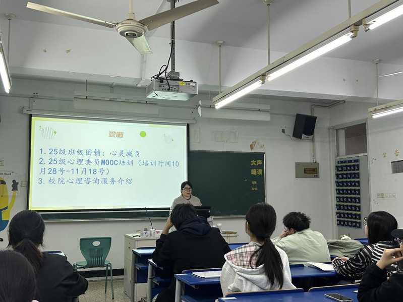 为进一步落实“ 三全育人”实施方案,推进我院心理育人平台建设,充分发挥心理委员在我校心理健康教育四级网络体系中的重要作用,提高心理委员的理论素养与工作能力,更好地开展心理互助、自助及心理危机预警等工作,2025年11月4日,英语学院心聆意站鲁梅老师组织25级各班心理委员组织开展班级团辅活动工作。本次团辅以心理委员通过班会形式开展,主题为“心灵减负”,以话题讨论的方式,了解什么是心理健康,增进心理健康的途径,遇到心理困扰我们该怎么办。并通过此次团辅,在新生普及心理健康知识和院校两级心理辅导的咨询联系方式。