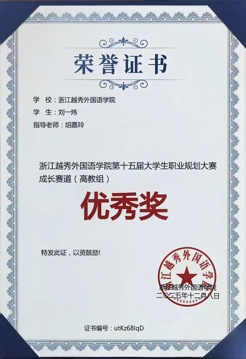 商务英语2304班 刘一炜同学荣获校级优秀奖