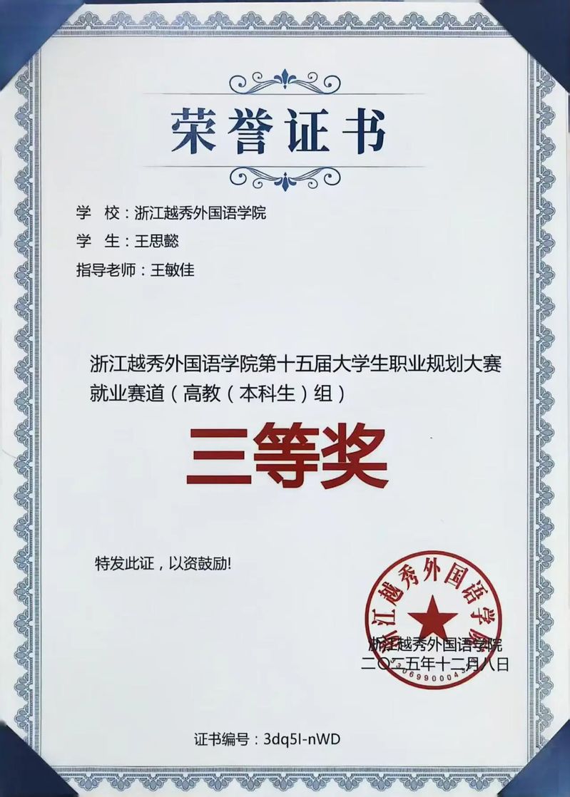 商务英语2302班 王思懿同学荣获校级三等奖