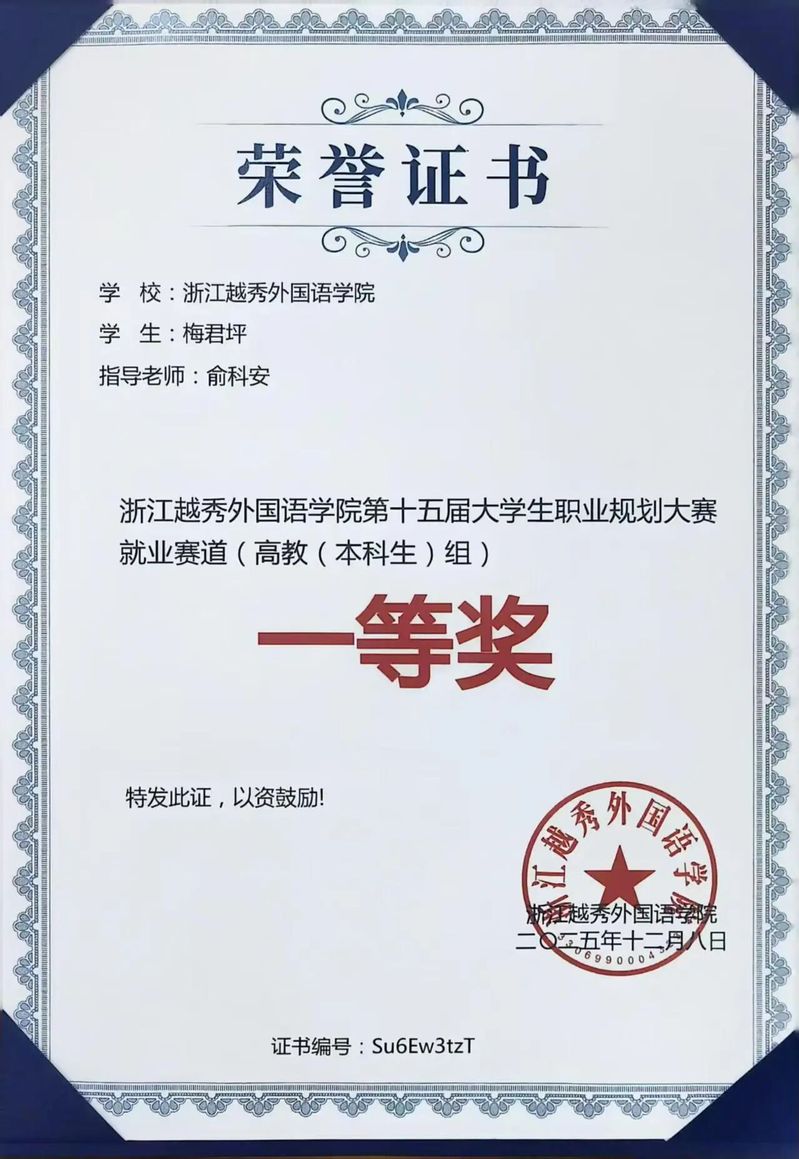 翻译2304班 梅君坪同学荣获校级一等奖