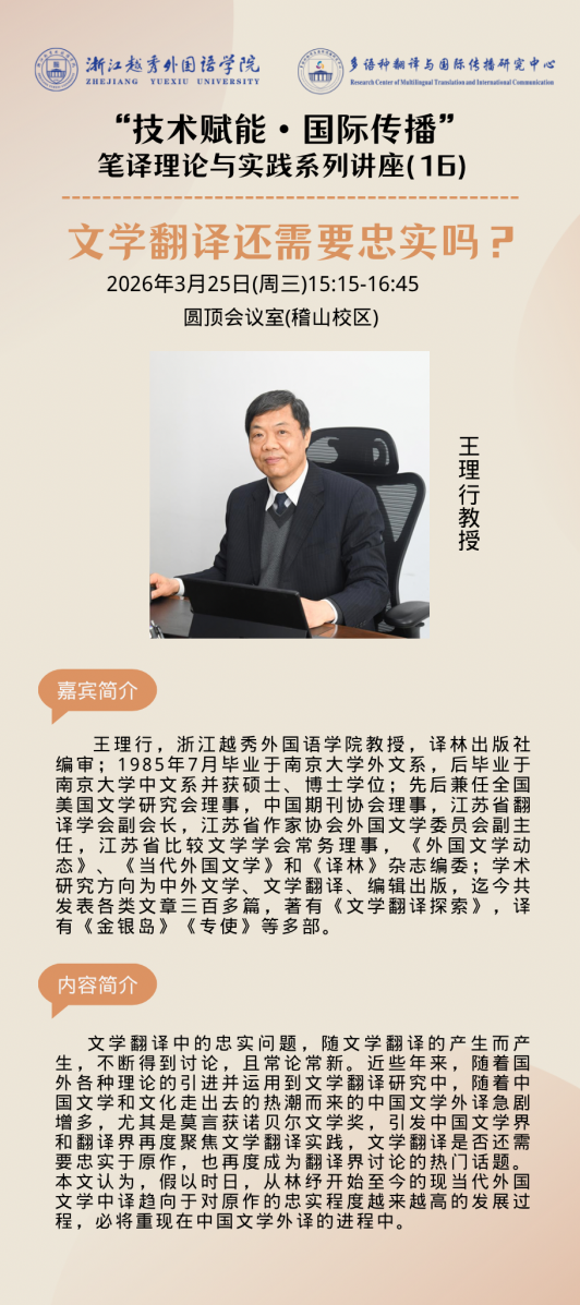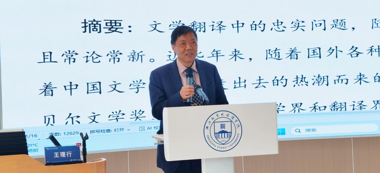 3月25日下午,受浙江越秀外国语学院英语学院及多语种翻译与国际传播研究中心之邀,我校世界文学与区域国别研究院王理行教授为我校师生开展讲座,主题为“文学翻译还需要忠实吗?”。讲座由英语学院周成龙博士主持。