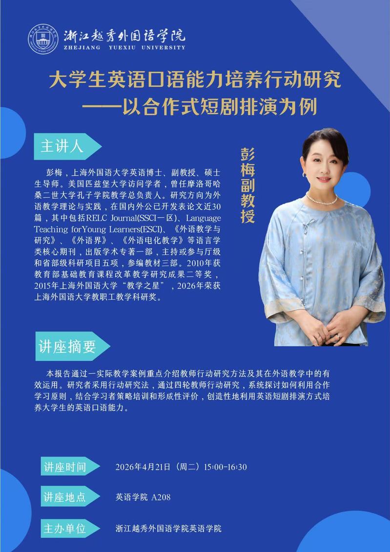 学术讲座通知:大学生英语口语能力培养行动研究--以合作式短剧排演为例 彭梅副教授